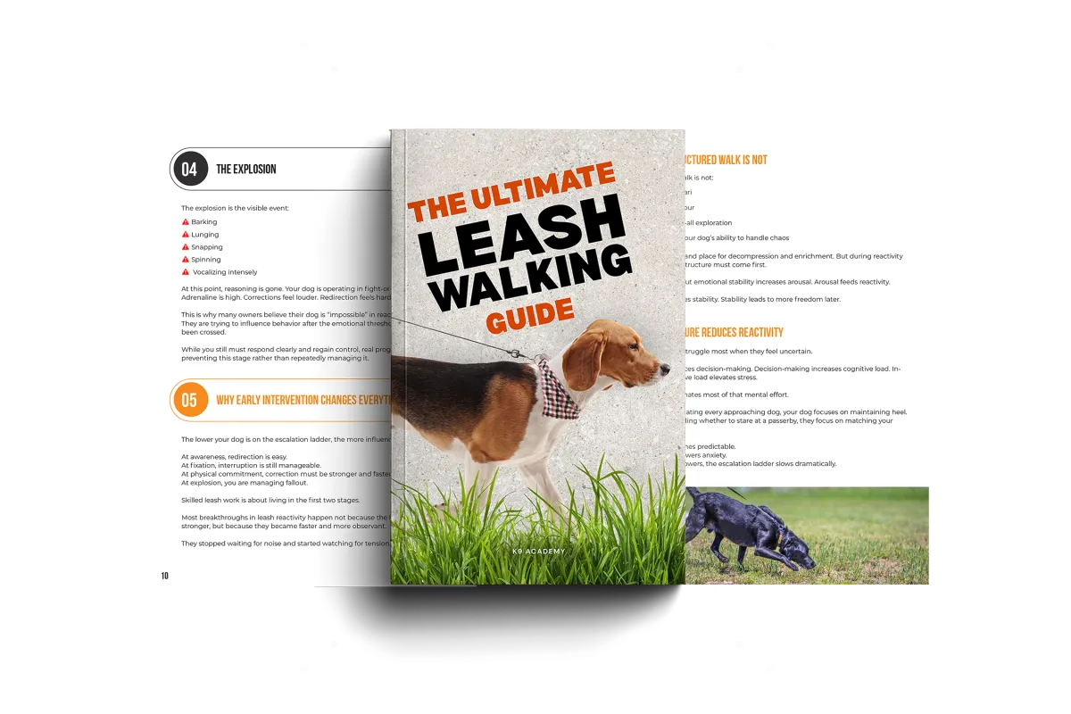 No more embarrassment & public stress. Reactive outbursts in public can feel humiliating and exhausting. Barking, lunging, and tense leash moments often leave owners feeling judged and on edge. The Reactivity Reset 7-Book Bundle gives you a structured approach to prevent escalation before it happens. Through engagement work, position training, and clear leash communication, you’ll learn how to guide your dog through distractions with more composure and control—so walks feel manageable again instead of stressful.